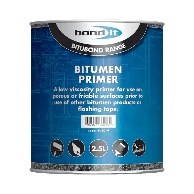Bond It Bitumen Primer is a high-quality, penetrative, bituminous solution designed to prime surfaces before applying bituminous materials and flashing tapes. It’s ideal for heavy-duty applications, including priming concrete roofs, floors, cementitious screeds, bitumen felt, weathered bitumen, mastic asphalt, and weathered corrugated iron and steel. This primer is easy to apply by brush or roller and provides a waterproof, weatherproof barrier that protects substrates from corrosion. It is resistant to low concentrations of alkalis and acids and can withstand prolonged oxidation, making it perfect for exterior use.
