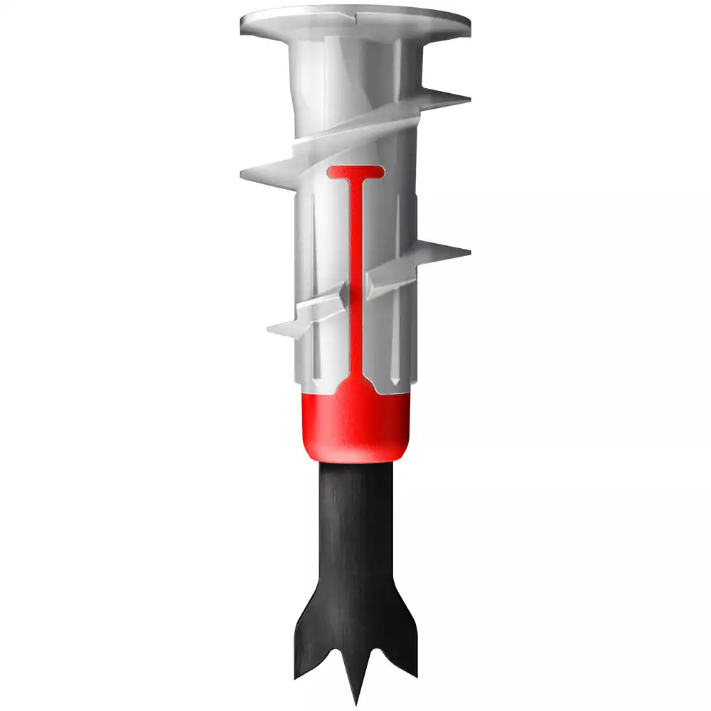 The fischer DuoBlade is part of the innovative DuoLine and therefore consists of different components, which enable the best possible performance. The self-drilling tip allows a clean and effective drilling procedure. The fixing is screwed in the pre-positioned installation with the (cordless) screwdriver setting tool flush to the surface of the gypsum plasterboard. The fischer DuoBlade is adapted for wood, metal and chipboard screws from 4 to 5 mm thickness as well as different hooks and eye screws. Consequently, it is universally suitable for fixing e.g. smoke detectors, curtain rods and shutters securely and quickly. The DuoBlade is placed in the plasterboard with a conventional PZ 2 drive. No special setting device is required.