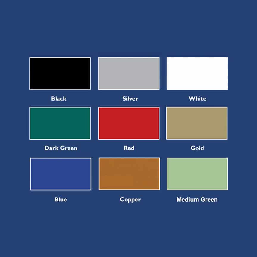 BLACK, COPPER, DARK BLUE, DARK GREEN, GOLD, MEDIUM GREEN, SILVER, SMOOTH RED, WHITE